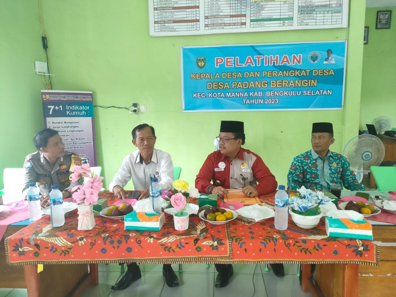 Bengkulu Selatan – Dalam Rangka peningkatan kemampuan kades dan perangkat Desa Padang Berangin, Bhabinkamtibmas Polsek Kota Manna Polres Bengkulu Selatan Polda Bengkulu, menghadiri kegiatan Pelatihan Kepala Desa Dan Perangkat Desa, Desa Padang Berangin Tahun 2023, Kamis (21/09/2023) jam 09.00 WIB.