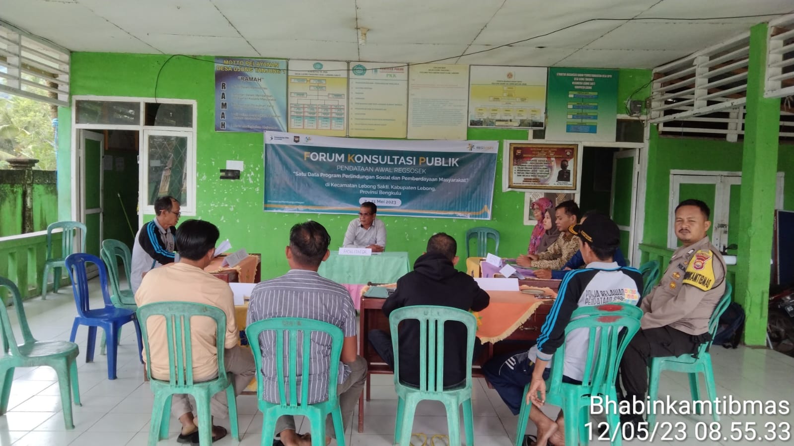 Lebong - Bhabinkamtibmas Polsek Lebong Tengah Polres Lebong Polda Bengkulu Bripka Abdul Alamsyah, menghadiri kegiatan Forum Konsultasi publik (FKP) pendataan Regsosek yang diadakan oleh Badan Pusat statistik (BPS) di Balai Desa Ujung Tanjung I Kecamatan Lebong Sakti Kabupaten Lebong, Jumat (12/5/2023) pagi di balai desa setempat.