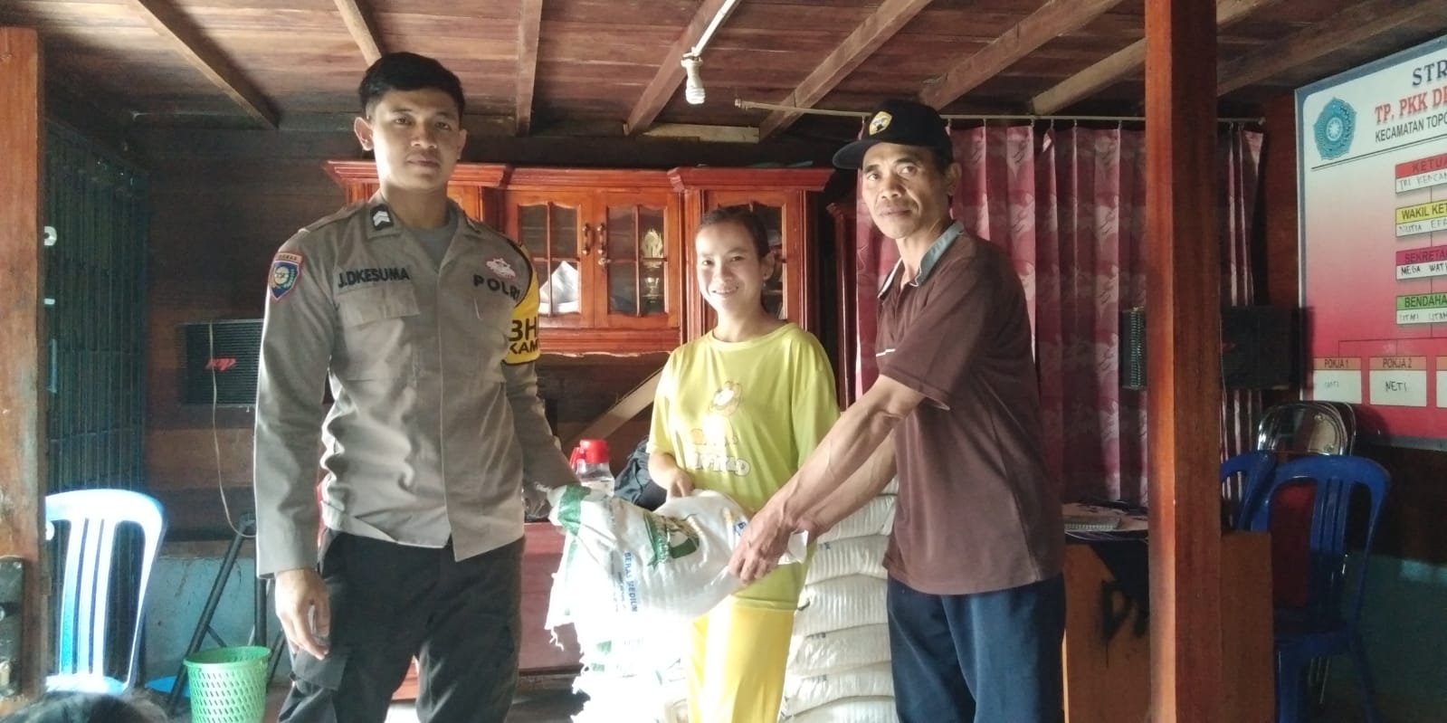 Lebong - Briptu Jaka Dwi Kesuma, yang merupakan Bhabinkamtibmas Polsek Rimbo Pengadang Polres Lebong Polda Bengkulu, menghadiri kegiatan pembagian beras dari Badan Pangan Nasional melalui Perum Bulog sebanyak 62 karung dengan berat 10 Kg/karung.