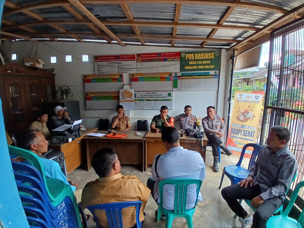 Lebong - Dalam rangka cooling system pasca Pilkada, Kanit Binmas dan Bhabinkamtibmas Polsek Rimbo Pengadang Polres Lebong Polda Bengkulu, melaksanakan kegiatan Ngopi Bareng warga di Desa Tik Kuto Kecamatan Rimbo Pengadang Kabupaten Lebong, Selasa (10/12/2024).