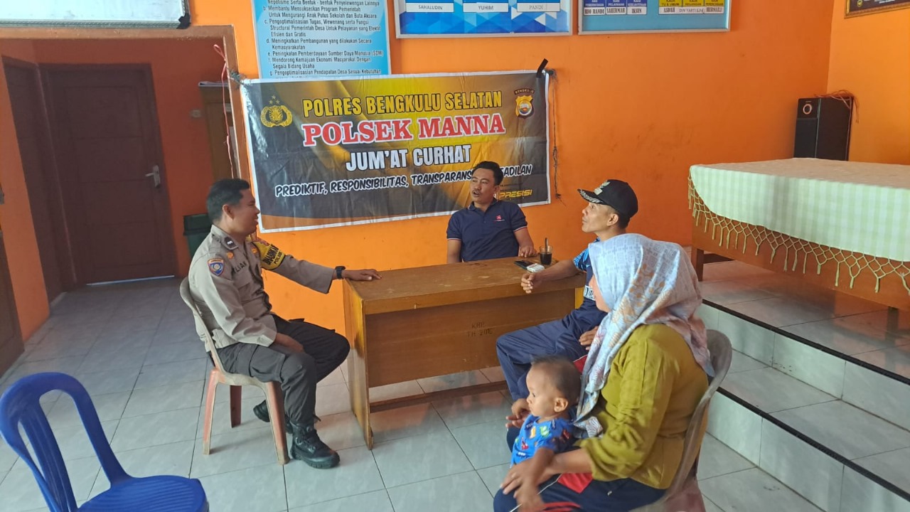 Bengkulu Selatan - Polsek Manna Polres Bengkulu Selatan Polda Bengkulu - melakukan Banyak cara lebih mengetahui maunya masyarakat kepada polisi, seperti Program Bhabinkamtibmas Polsek Manna Terbukti berguna, pada kenyataannya dengan Jum'at Curhat tersebut, hubungan baik antara Insan Polri dengan masyarakat di jajaran Polsek Manna Polres Bengkulu Selatan tersebut selama ini terjalin sangat baik, seperti saat dilaksanakan Jumat Curhat, di Desa Tambangan Kecamatan Manna Kabupaten Bengkulu Selatan, Jumat (30/08/24).