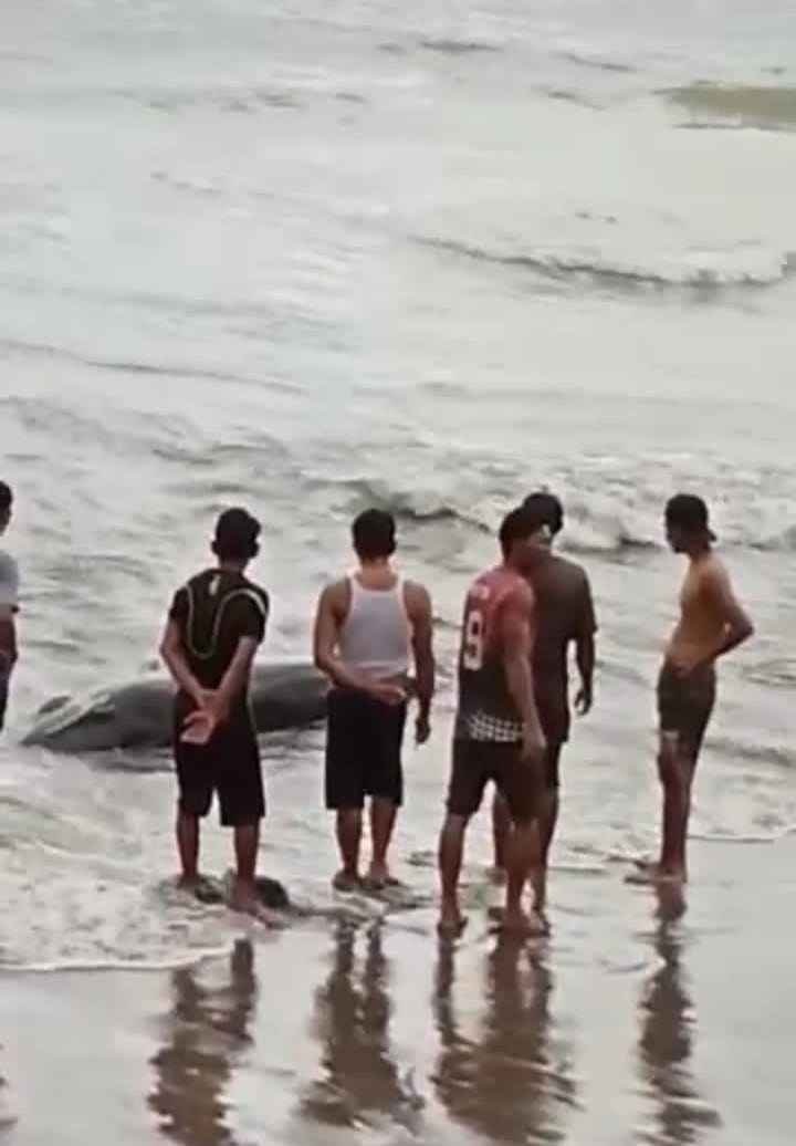 Bengkulu Utara - Telah ditemukan oleh warga Desa Serangai Kec Batik Nau Kabupaten Bengkulu Utara, Ikan Paus yang terdampar dipinggir pantai setempat, Jumat (9/6/2023).