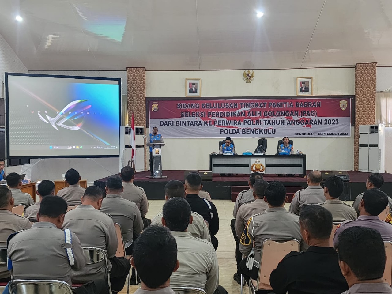 Bengkulu – Wakapolda Bengkulu Brigjen Pol Drs Agus Salim didampingi Karo SDM Polda Bengkulu Kombes Pol Arif Fajarudin memimpin sidang akhir kelulusan seleksi Pendidikan Alih Golongan (PAG) T.A 2023 di gedung Adem Mapolda Bengkulu kemarin (Selasa, 26/09/23).