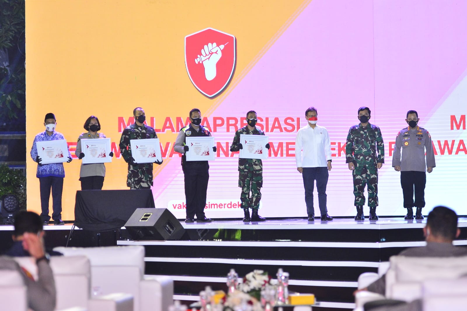 Jakarta, Dutawarta.com - Panglima TNI Marsekal Hadi Tjahjanto, Kapolri Jenderal Listyo Sigit Prabowo, dan Menteri Kesehatan (Menkes) Budi Gunadi Sadikin menghadiri kegiatan 'Malam Apresiasi Relawan Vaksinasi Merdeka' di Polda Metro Jaya, Selasa (17/8/2021).