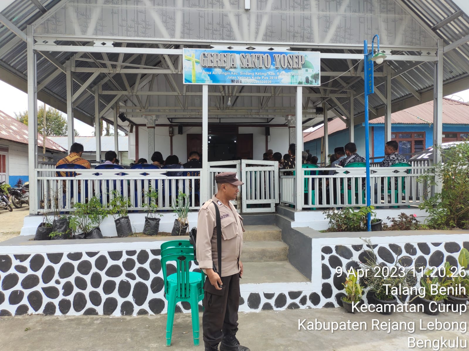 Rejang Lebong - Kapolsek Sindang Kelingi Iptu Andi Winawan, MM., dan anggota Polsek Sindang Kelingi melaksanakan kegiatan pengamanan ibadah di gereja Santo Yosep di Desa Air Dingin Kecamatan Sindang Kelingi Kabupaten Rejang Lebong. Minggu (09/04/2023).