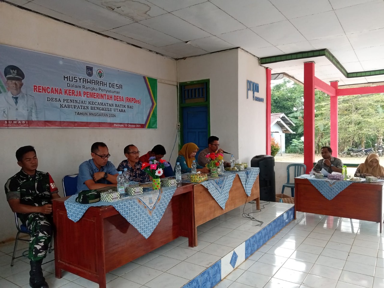 Bengkulu Utara – Untuk mewujudkan perencanaan tahunan Desa dalam upaya terwujudnya Rencana Kerja Pemerintah Desa yang partisipatif, berkesinambungan serta mensinergikan pembangunan dan pemberdayaan masyarakat, Badan Pemusyawatan Desa (BPD) bekerja sama dengan Pemerintah Desa melaksanakan Musyawarah Desa (Musdes) dalam rangka penyusunan Rancangan RKP Desa Tahun 2024 di Aula Kantor Desa Peninjau Kecamatan Batiknau Kabupaten Bengkulu Utara. Kamis (19/10/2023)