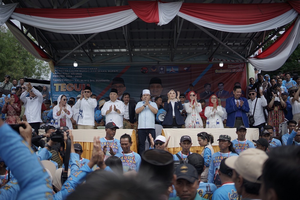 Seluma - Pasangan bakal calon Bupati dan Wakil Bupati Seluma, Teddy Rahman dan Gustianto menggelar acara pesta rakyat di Lapangan Sepakbola Lubuk Kebur, Tais Seluma dengan dihadiri oleh pulahan ribu pendukung, Rabu (28/8/24).