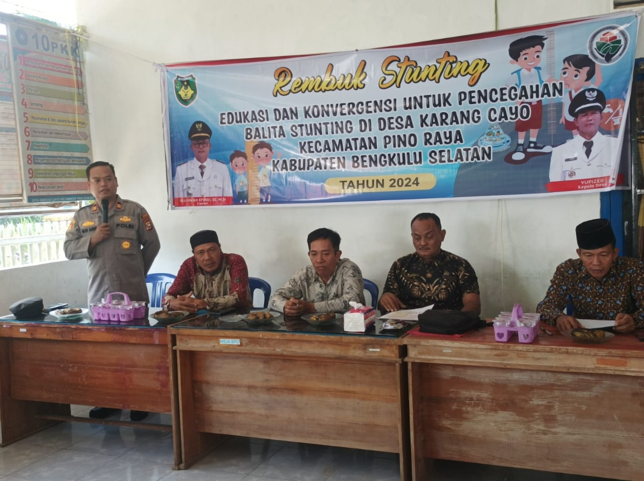 Bengkulu Selatan - Kapolsek dan Bhabinkamtibmas Polsek Pino Raya Polres Bengkulu Selatan Polda Bengkulu, Iptu Muh Amirudin, S.Sos., S.IP., dan Aipda Marzon Advawi hadiri rapat kerja Mini Lokakarya Pengendalian Stunting Desa Karang Cayo Kecamatan Pino Raya Kabupaten Bengkulu Selatan, Selasa (24/10/23).