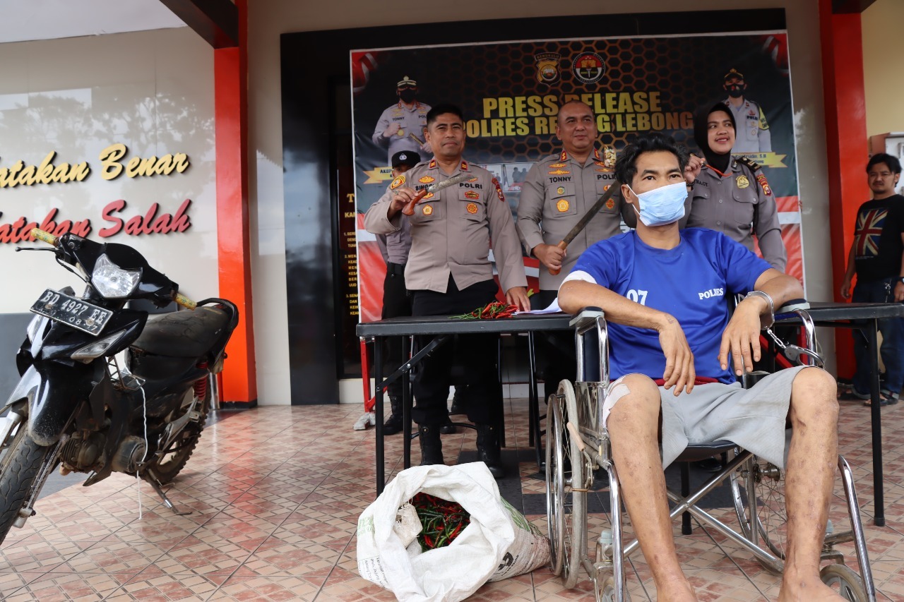 "Petugas yang sedang berpatroli kemudian mendatangi TKP dan mengamankan terduga pelaku bersama barang bukti sekitar 10 Kg cabai rawit dan cabai merah seitar 5 Kg, serta sebilah senjata tajam milik terduga pelaku," terang Kapolres Rejang Lebong Polda Bengkulu AKBP Tonny Kurniawan, saat press release di Mapolres, Senin (9/1/2023).
