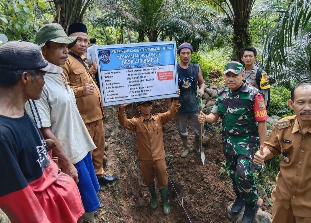 Titik nol pembangunan saluran irigasi desa air baus 1 kecamatan Hulu Palik Bengkulu Utara Dengan volume 46 M dan normalisasi 300 M dengan Dana sebesar Rp.90.690.080.00,- dari sumber Dana Desa T.A 2023.