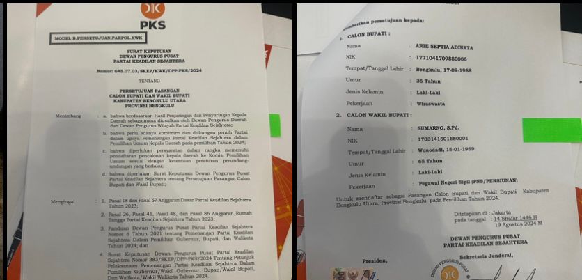 Bengkulu Utara - Dewan Pengurus Pusat Partai Keadilan Sejahtera secara resmi memberikan rekomendasinya kepada Arie Septia Adinata dan Sumarno, sebagai calon Bupati dan Wakil Bupati Bengkulu Utara pada Pilkada serentak tahun 2024.