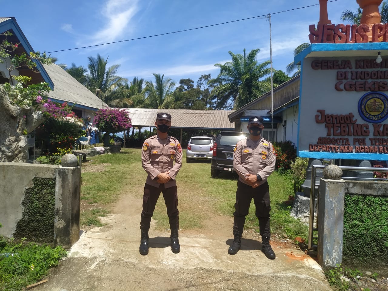 Bengkulu Utara - Personel Polsek Air Besi Polres Bengkulu Utra Polda Bengkulu secara rutin melaksanakan pengamanan kegiatan ibadah Mingguan digereja Gekisia Jemaat Ebenhaezer di Desa Tebiung Kandang Kecamatan Air Napal Kabupaten Bengkulu Utara Minggu, (26/03/2023).