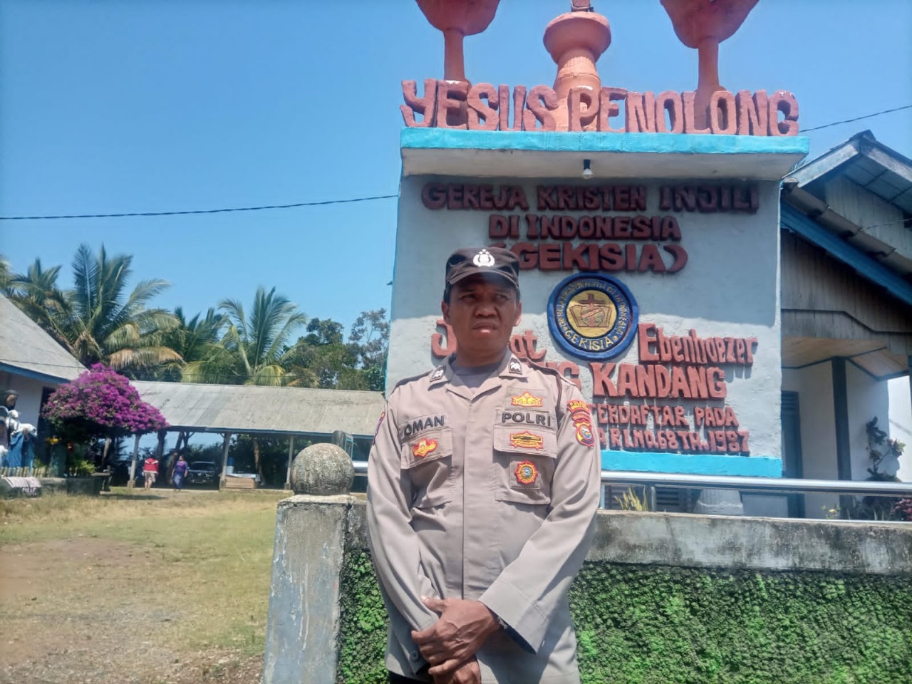 Bengkulu Utara  - Aiptu Oman, S.H., bersama dengan Aiptu Zarkoni Personel Polsek Air Besi Polres Bengkulu Utara Polda Bengkulu, melaksanakan Pengamanan Ibadah Minggu di Gereja Gekisia Jemaat Ebenhaezer Desa Tebing Kandang Kecamatan Air Napal Kabupaten Bengkulu Utara, Minggu (03/09/2023).