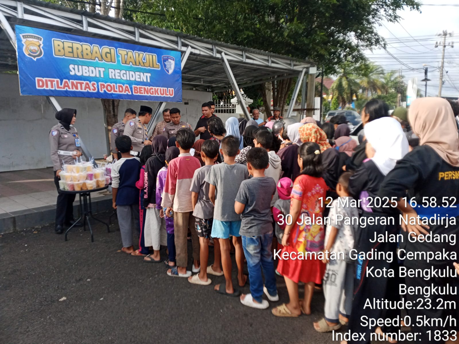 Bengkulu - Subdit Regident Ditlantas Polda Bengkulu yang dipimpin AKBP Riky Crisma Wardana, S.I.K., membagikan takjil kepada masyarakat. Takjil tersebut dibagikan kepada masyarakat disekitar Balai Buntar Kota Bengkulu, setiap sore hari dimulai pukul 17.00 WIB.