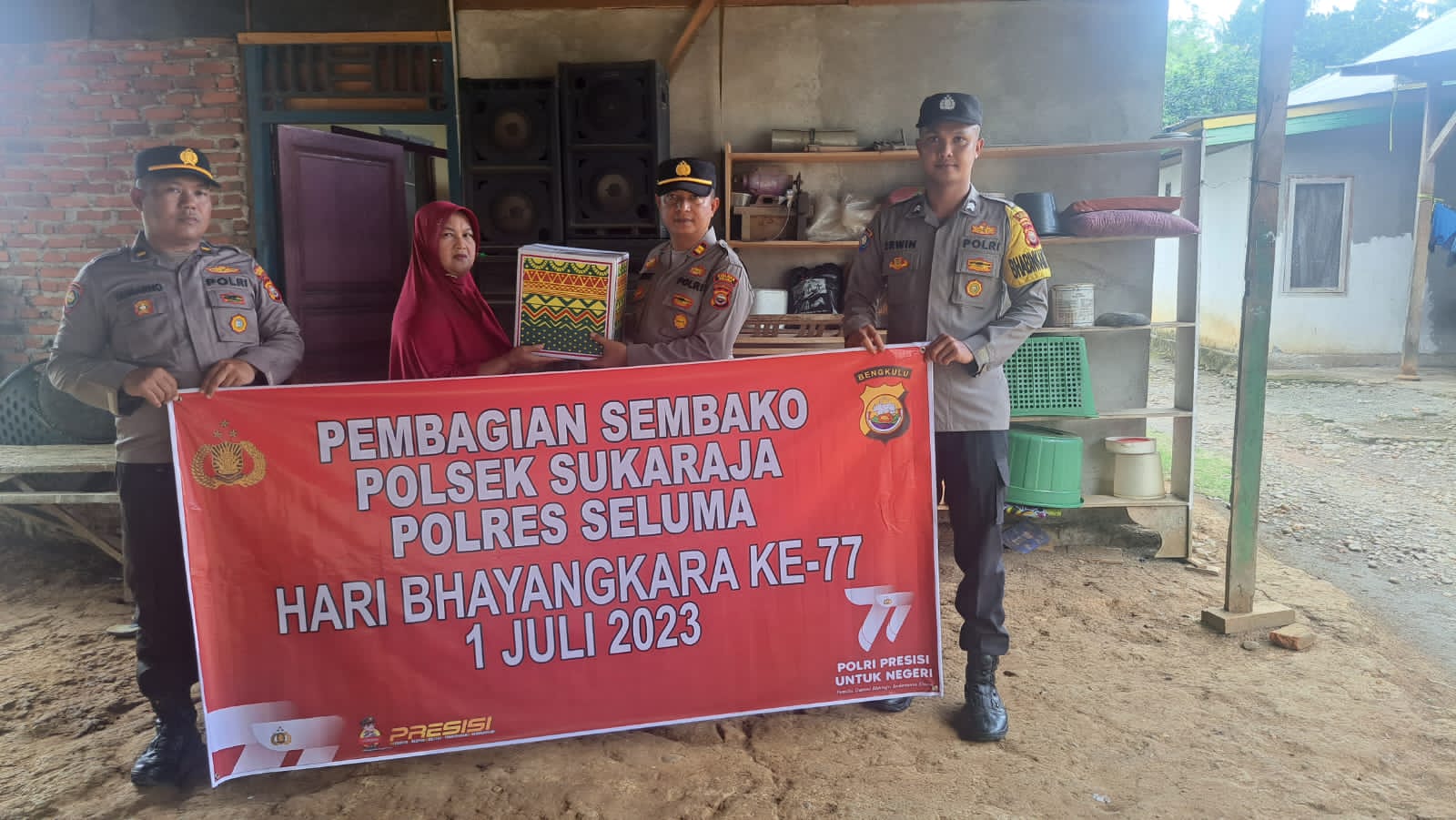 Seluma - Dalam Rangka HUT Bhayangkara ke-77, Kapolsek Sukaraja Polres Seluma Polda Bengkulu, Iptu Prengki Sirait, S.H., di dampingi personel melaksanakan giat pemberian Bantuan Sembako dari Personel Polsek Sukaraja, Rabu (14/06/2023) pukul 11.00 WIB s/d Selesai.