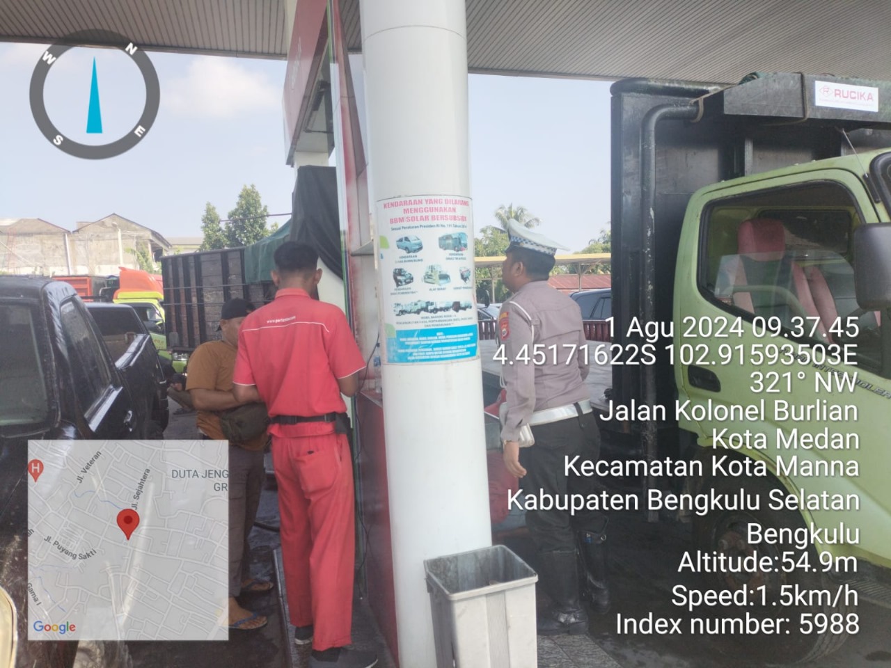 Bengkulu Selatan - Sat Lantas Polres Bengkulu Selatan Polda Bengkulu, melaksanakan giat pengawasan pendistribusian dan pengisian BBM serta pengaturan arus lalulintas dimana dianggap berpotensi terjadinya lakalantas di kabupaten bengkulu selatan terutama pada jam jam sibuk aktifitas masyarakat, pada hari Kamis (01/08/24).