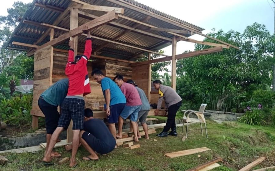 Berikan Motivasi, Bhabinkamtibmas Ikut Bergotong-royong Membangun Pos Kamling