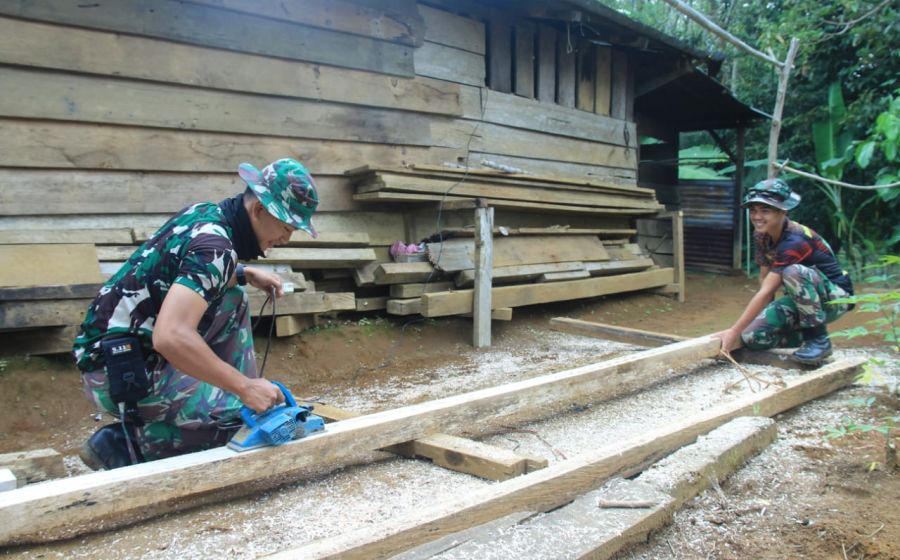 Satgas TMMD Ke-114 BU Terlihat Terampil Gunakan Alat Sugu mesin Penghalus Kayu