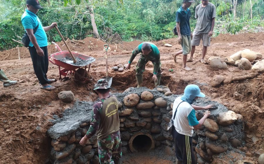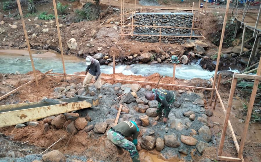 Terus Satgas TMMD ke 114 Kodim 0423/BU Bersinergi Bersama Warga Pasang Pondasi Jembatan