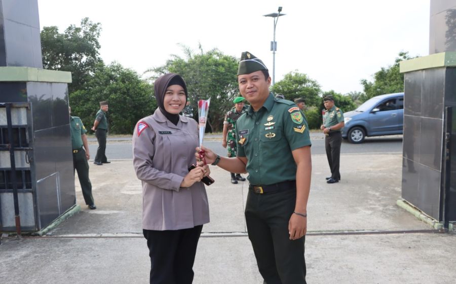 Berikan Ucapan HUT TNI ke 78, Personel Polwan Polres Mukomuko Berikan Bunga kepada Prajurit Kodim 0428