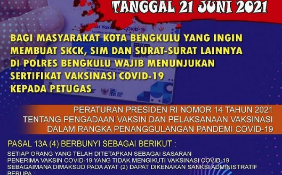 Urus SIM dan SKCK, Polres Bengkulu Wajibkan Sertifikat Vaksinasi Covid-19