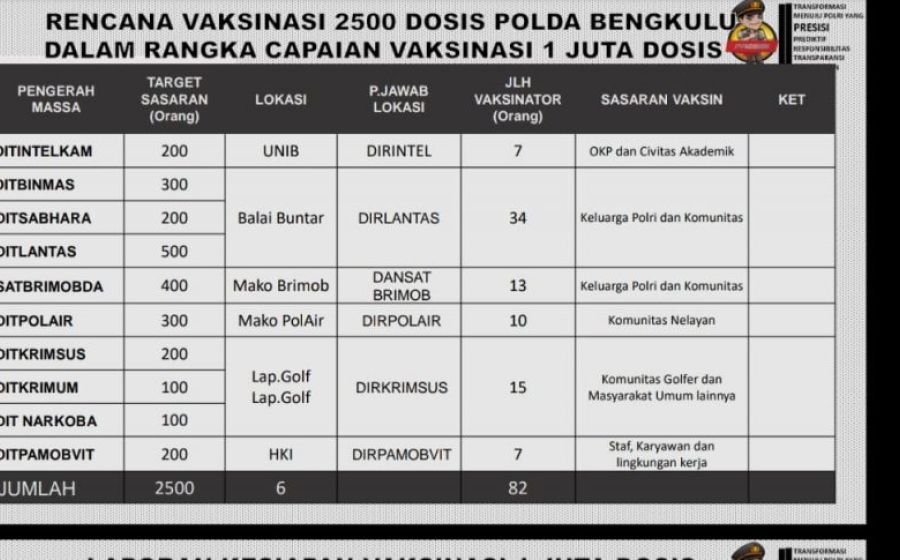 Polda Bengkulu Akan Gelar Vaksinasi Covid-19 Serentak di 6 Lokasi