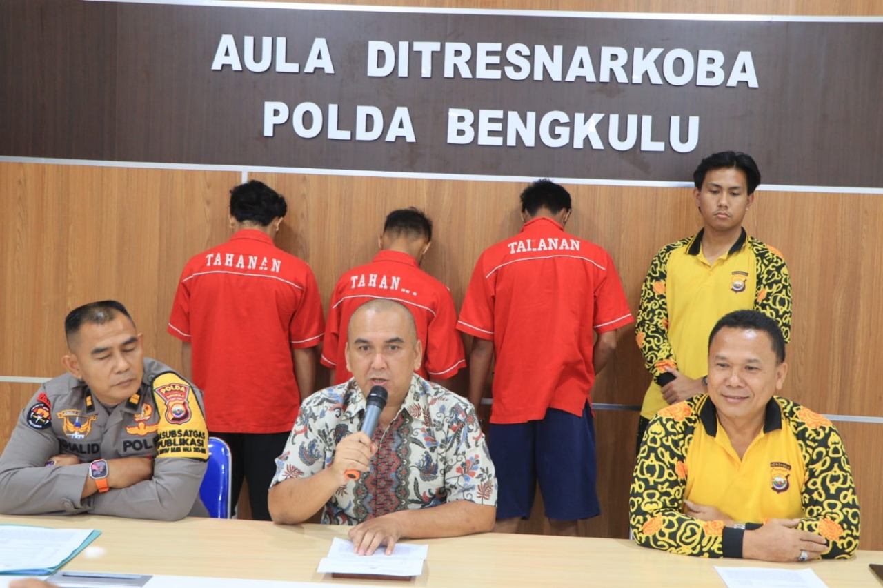 Bengkulu – Subdit II Direktorat Reserse Narkoba Polda Bengkulu, berhasil membekuk tiga pelaku penyalahgunaan narkoba. Hal tersebut disampaikan dalam konferensi pers Jumat pagi (19/01/2024) di aula Resnarkoba dengan dihadiri langsung Wadir Resnarkoba Polda Bengkulu AKBP. Tonny Kurniawan, S.I.K.