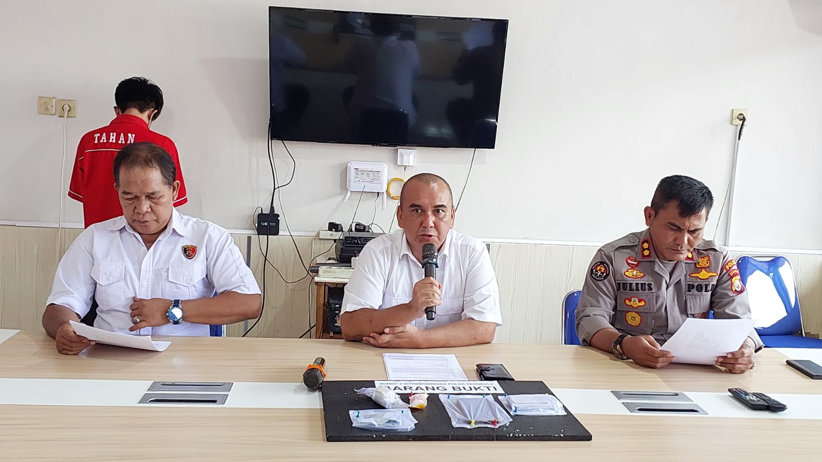 Wadirres Narkoba Polda Bengkulu AKBP Tonny Kurniawan saat press release di Mapolda Bengkulu, Senin (2/10/2023) menyampaikan, saat digeledah dan diperiksa, petugas mendapatkan 1 paket Narkoba jenis Sabu yang dibuang di siring dekat HR saat ditanggkap, dan 9 paket Sabu dari rumah HR.
