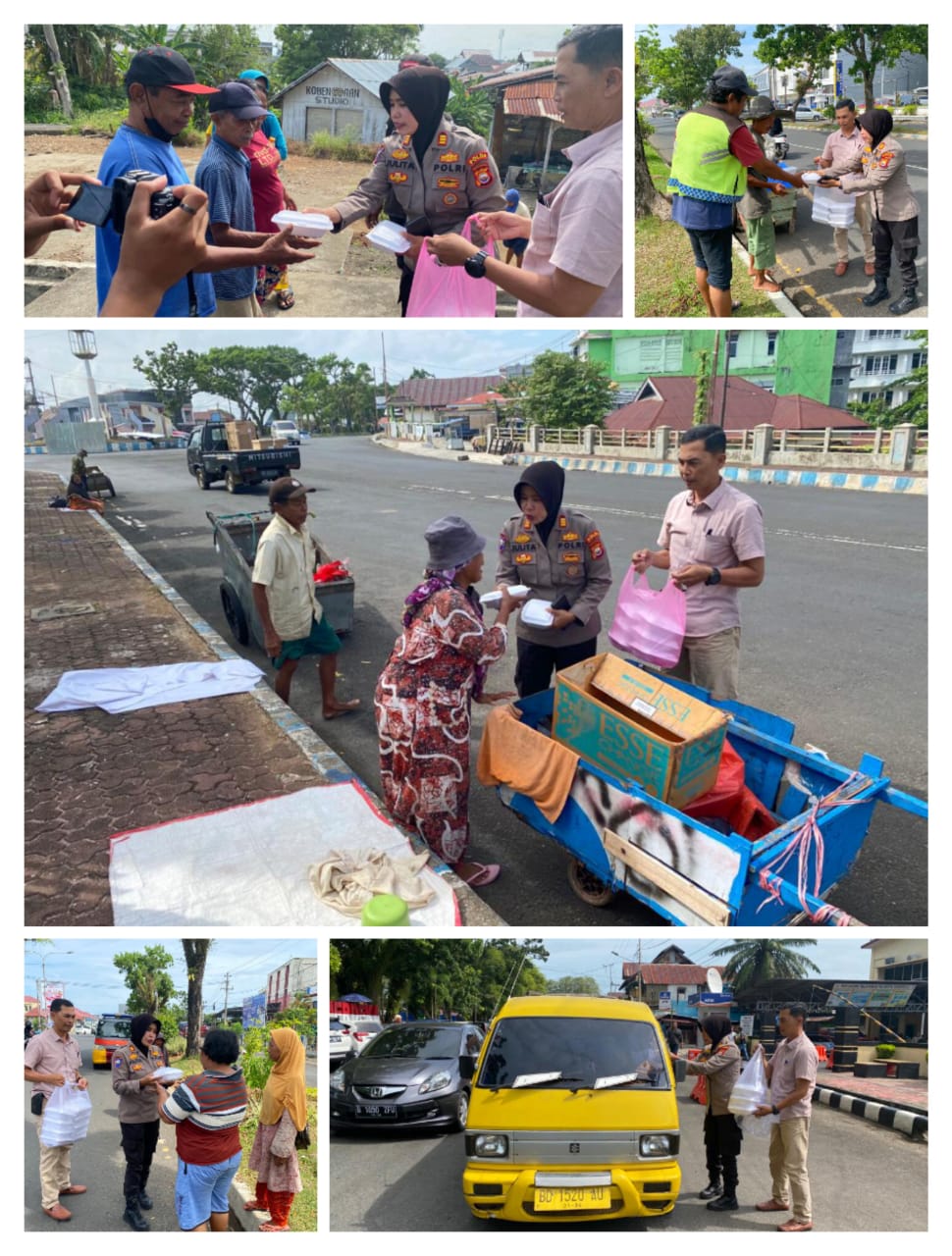 Terpantau personel Polresta Bengkulu dengan ramah membagikan Nasi Kotak ke warga kurang mampu maupun yang sedang beraktivitas di sepanjang Jalan Ahmad Yani dan Jalan Jendral Sudirman Kecamatan Teluk Segara Kota Bengkulu, Jumat (19/05/23).