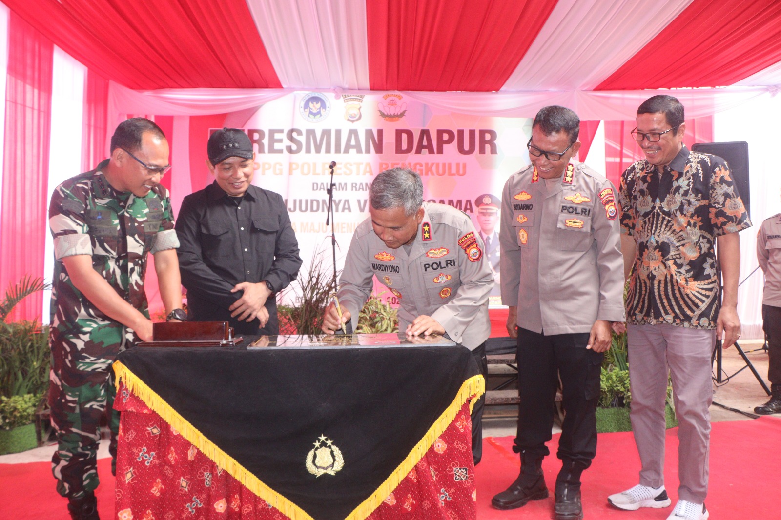 Bengkulu, 11 Juli 2025 - Kapolda Bengkulu, Irjen Pol Mardiyono,S.I.K ., M.Si., meresmikan Dapur Satuan Pelayanan Pemenuhan Gizi (SPPG) Kota Bengkulu di Jalan Regional 9A/B, Pekan Sabtu, Kecamatan Selebar, Kota Bengkulu, Jumat (11/7/2025). Peresmian ini ditandai dengan penandatanganan prasasti oleh Kapolda Bengkulu dan pemotongan pita oleh Wali Kota Bengkulu, H. Helmi Hasan.