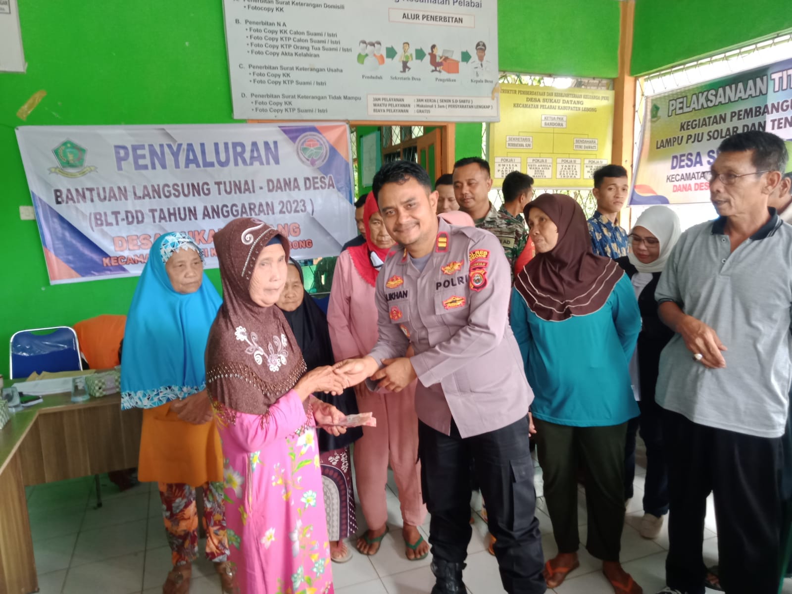 Lebong - Bentuk pendampingan, Bhabinkamtibmas Polsek Lebong Atas Bripka Freddy Adhi Brata, menghadiri kegiatan pembagian Bantuan Langsung Tunai Dana Desa (BLT-DD) tahap I Tahun 2023, penyaluran bantuan pupuk kegiatan peningkatan produksi tanaman pangan penunjang masa tanam 2 kali (MT2) dan kegiatan pembangunan titik nol lampu tenaga surya di Desa Sukau Datang Kecamatan Tubei, Kabupaten Lebong, Jumat (19/5/2023).