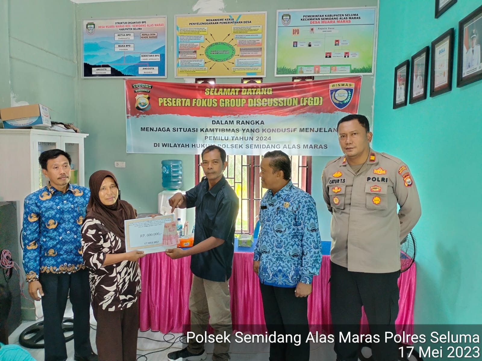 Seluma - Pada hari Rabu (17/05/2023), Kapolsek Semidang Alas Maras Iptu Catur Teguh Susanto. S.H., menghadiri pembagian/penyaluran BLT - DD di Balai Desa Muara Maras Kecamatan Semidang Alas Maras Kabupaten Seluma.