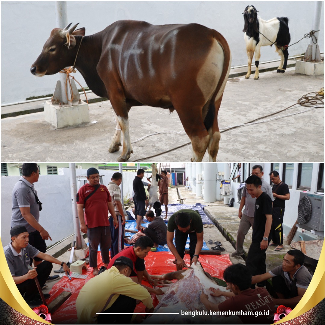 Sebanyak satu ekor sapi dan satu ekor kambing dikurbankan dalam prosesi pemotongan yang dilakukan sesuai dengan syariat Islam. Kegiatan ini dihadiri langsung oleh Kepala Kantor Wilayah Kemenkumham Bengkulu, Santosa, yang didampingi oleh para pimpinan tinggi, pejabat struktural, JFT, JFU, serta pegawai yang tergabung dalam panitia pemotongan hewan kurban.
