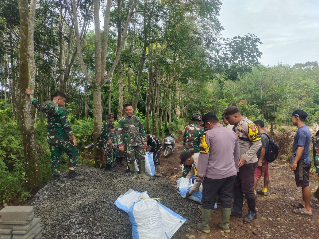Di lapangan, suasana kerja tampak penuh kebersamaan. Personel Satgas TNI bersama anggota Polsek setempat dan warga saling membantu tanpa mengenal lelah. Ada yang mengisi karung dengan pasir dan batu koral, ada pula yang mengangkutnya menggunakan motor kebun menuju lokasi rabat beton.