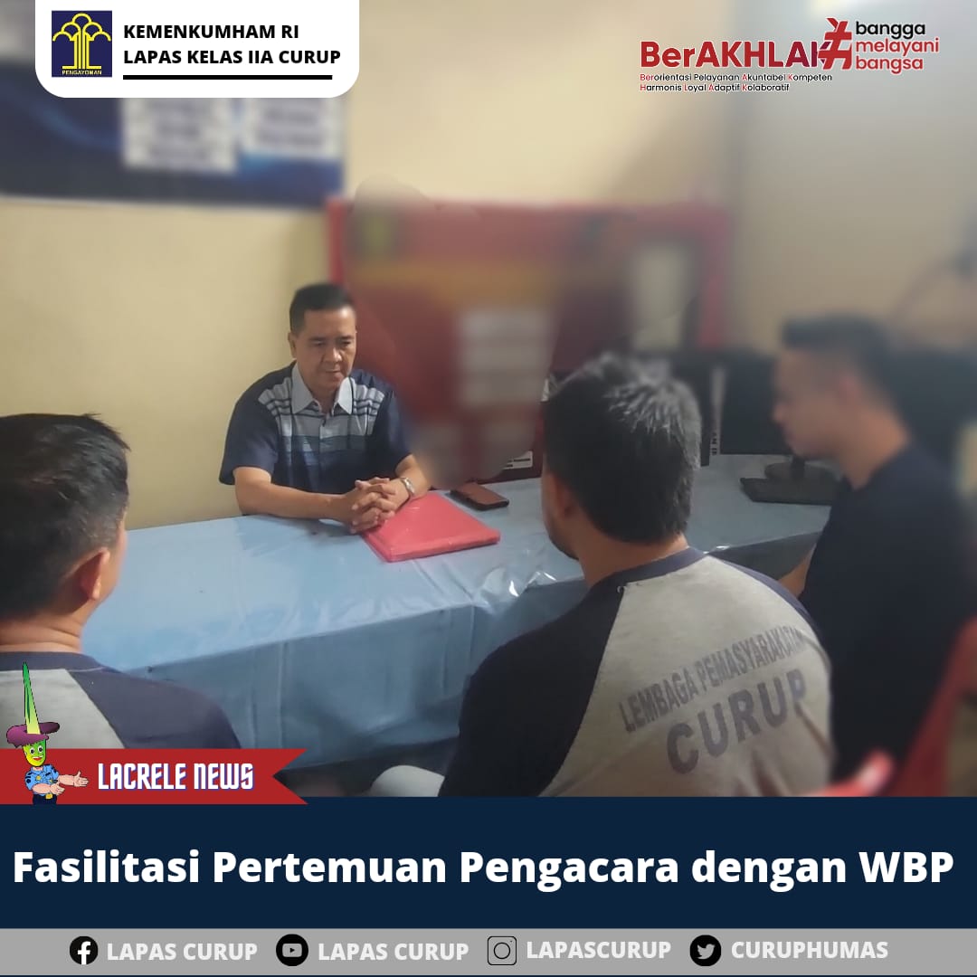 Lapas Kelas IIA Curup, pagi ini bertempat di ruang registrasi kembali memfasilitasi pertemuan pihak penasehat hukum dengan WBP. Hal ini merupakan bentuk layanan prima bagi WBP berupa Layanan bantuan hukum. Pertemuan tersebut dilaksanakan dalam rangka memberikan pendampingan kepada WBP dalam menghadapi proses persidangan.