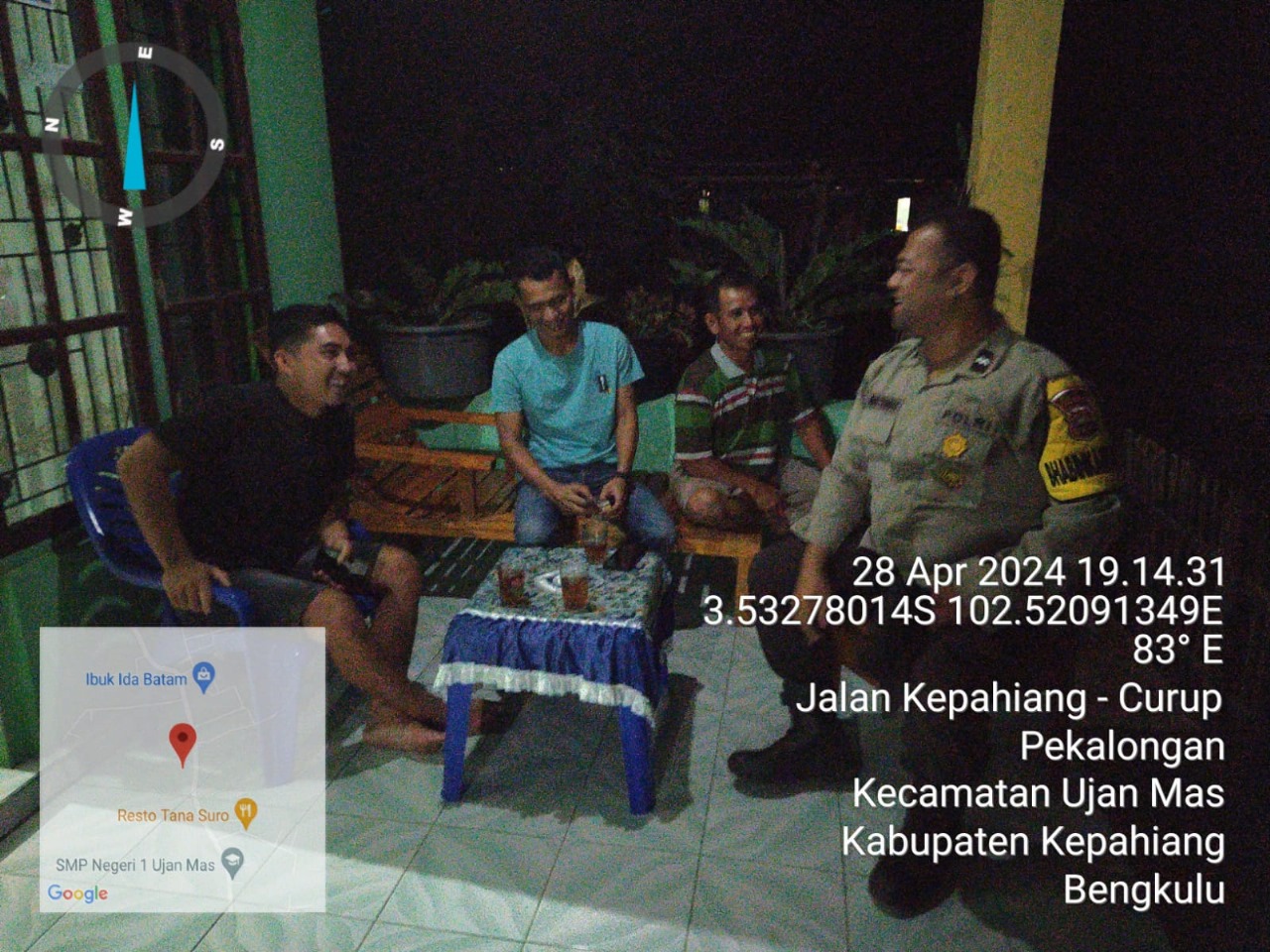 Seperti halnya yang dilakukan Bhabinkamtibmas Polsek ujan mas Polres kepahiang polda Bengkulu menyambangi warga yang sedang duduk-duduk santai dan ngobrol, pada kesempatan yang baik tersebut Bhabinkamtibmas menyampaikan pesan-pesan kamtibmas dan Mengajak masyarakat untuk meningkatkan kewaspadaan serta untuk bersama-sama ikut serta menjaga keamanan lingkungan guna mencegah terjadinya gangguan kamtibmas.