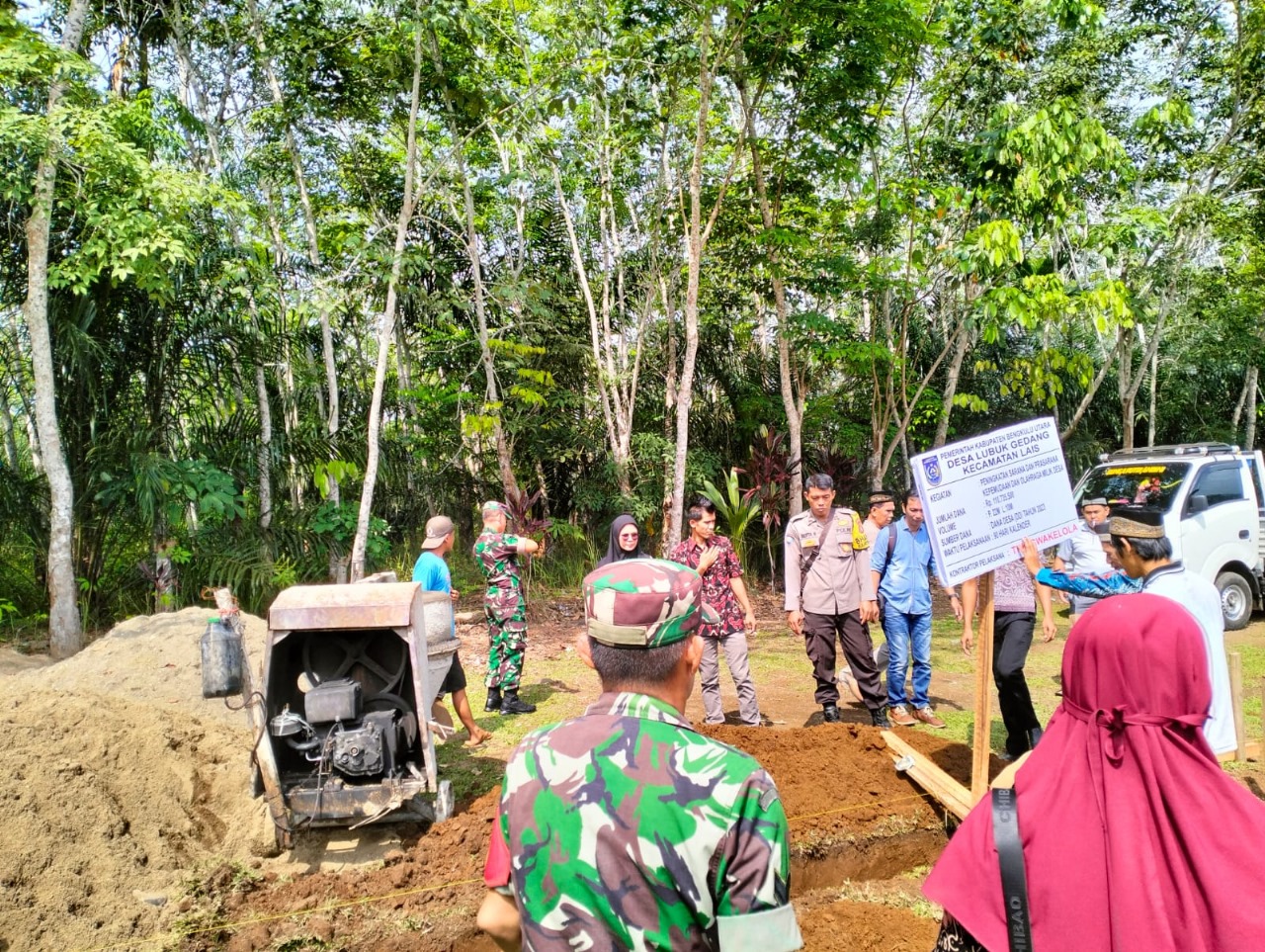 Bengkulu Utara - Kapolsek Lais Iptu Sukamto yang diwakili oleh Bhabinkamtibmas Aipda Beta Netra menghadiri acara Penetapan Titik Nol Pembangunan Lapangan Bola Volly di Desa Lubuk Gedang kecamatan Lais kabupaten Bengkulu Utara, pada Kamis (7/12/2023) pagi.