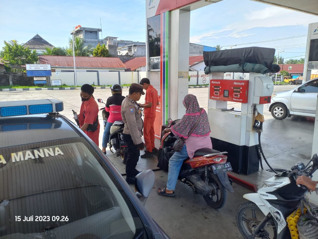 Bengkulu Selatan, - Patroli Unit Samapta Polsek Kota Manna Polres Bengkulu Selatan Polda Bengkulu, Aipda Istin Farizon S.H., bersama Briptu A Rozie.S.H., melaksanakan patroli dan pemantauan serta monitoring ketersedian BBM di SPBU Kutau, pada hari Sabtu (15/07/23) siang.