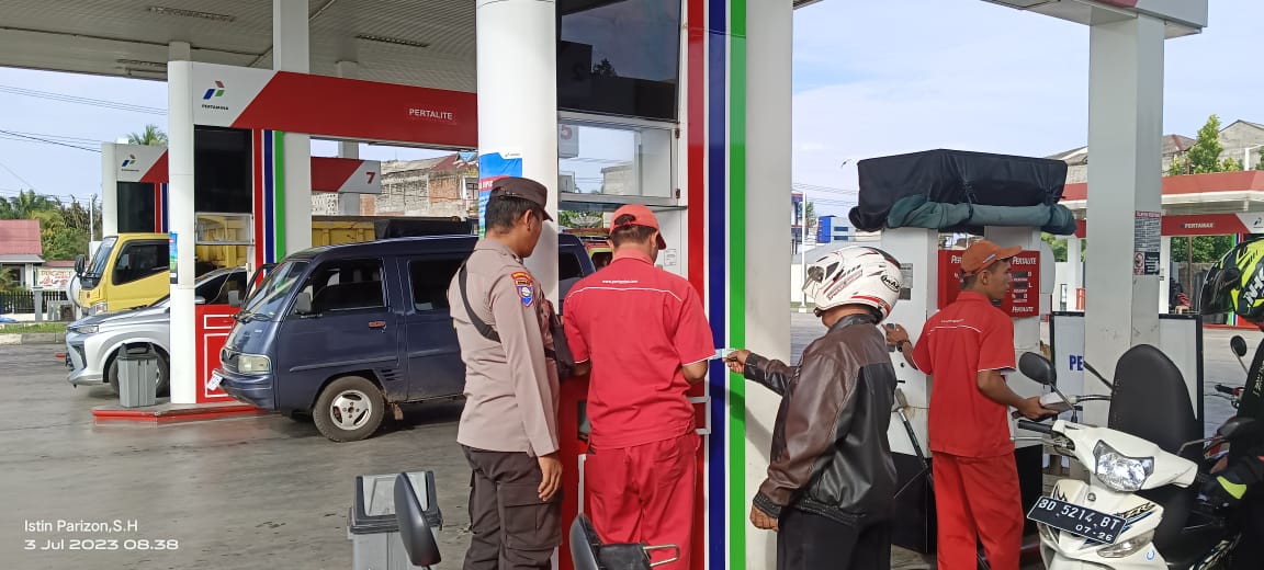 Dalam kesempatan tersebut Aipda Pujiono bersama Aipda Istin Farizon S.H.,  mengatur antrian kendaraan yang akan mengisi BBM sambil memberikan imbauan Kamtibmas kepada masyarakat dan petugas SPBU Kutau.