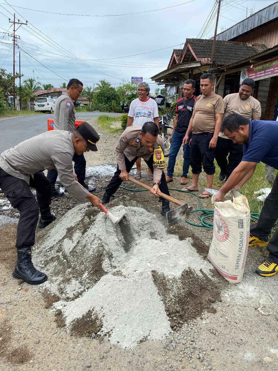 Peduli Keselamatan Berlalulintas, Polsek Padang Jaya Tambal Jalan Berlubang
