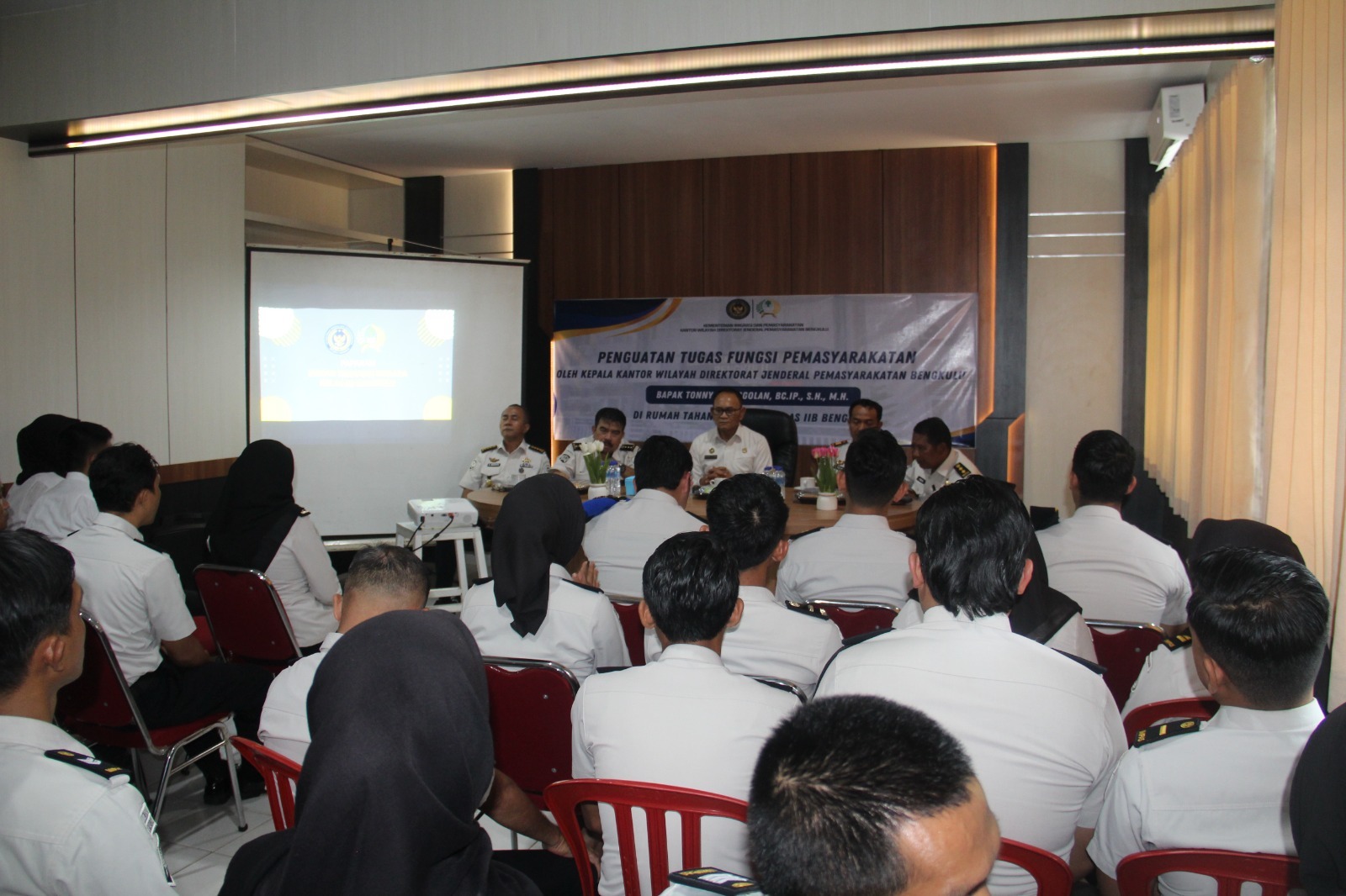 BENGKULU – Usai melaksanakan rangkaian peninjauan fasilitas, Rumah Tahanan Negara (Rutan) Kelas IIB Bengkulu menggelar kegiatan Penguatan Tugas dan Fungsi Pemasyarakatan yang dipimpin langsung oleh Kepala Kantor Wilayah Direktorat Jenderal Pemasyarakatan Bengkulu, Tonny Nainggolan. Kegiatan ini berlangsung di Aula Rutan Bengkulu dan diikuti oleh seluruh pejabat struktural serta staf jajaran Rutan Bengkulu, Kamis (30/4).