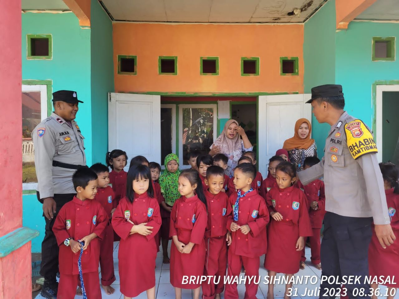 Dalam kegiatan Police Go To School itu, personel Personel Polsek Nasal, menyampaikan imbauan kepada guru dan murid TK Aisyah tentang tata tertib berkendara dan kenakalan remaja yang marak terjadi di Kecamatan Nasal Bhabinkamtibmas menjalin komunikasi dan mempererat tali silaturahmi dengan guru dan murid TK Aisyah serta untuk menjaga Harkamtibmas yang kondusif di Wilkum Polsek Nasal.