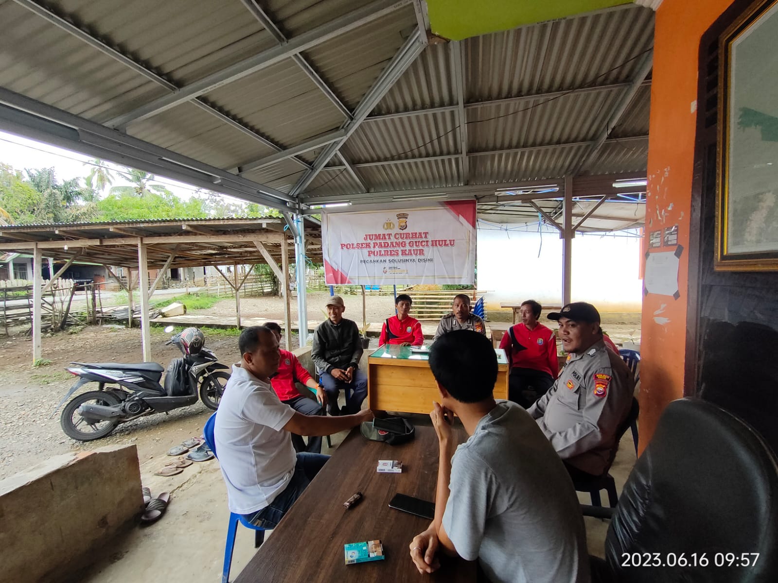 Kaur - Polsek Padang Guci Polres Kaur Polda Bengkulu menggelar Jumat Curhat, Jumat (16/06/2023). Jumat Curhat merupakan kegiatan rutin Polri yang dilaksanakan setiap hari Jumat disemua Polda, Polres dan Polsek jajaran.