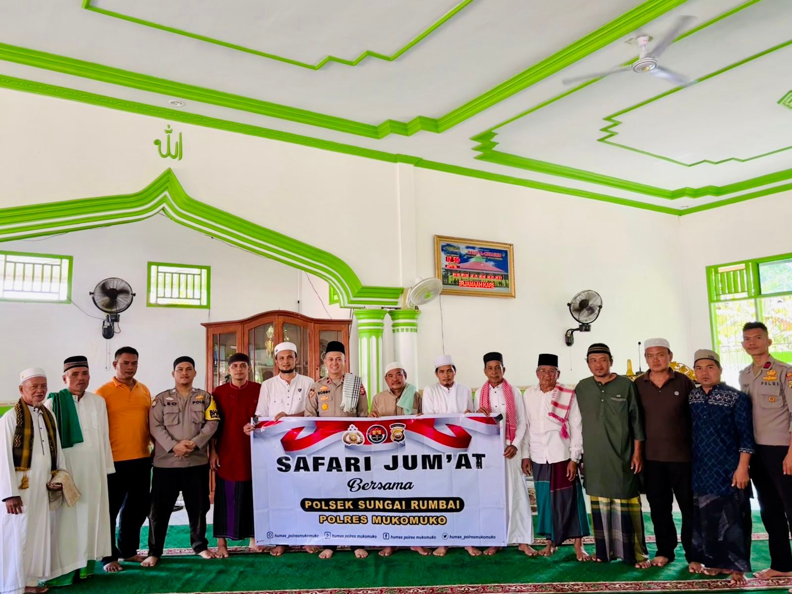 Mukomuko - Kapolsek Sungai Rumbai bersama personelnya melaksanakan Safari Jum’at dengan masyarakat Desa Gajah Mati, kegiatan yang digelar di Masjid Al Muhajirin Desa Gajah Mati Kecamatan Sungai Rumbai Kabupaten Mukomuko, turut dihadiri Tokoh Agama, Tokoh Masyarakat dan para jamaah sholat jum’at di mesjid tersebut, Jumat (14/6/24).