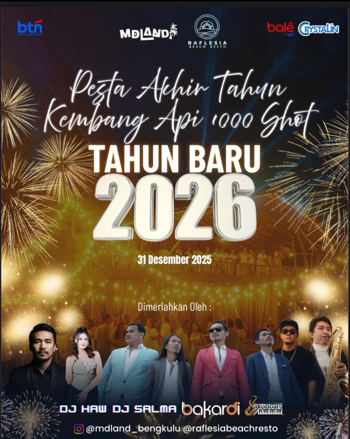 Dutawarta.id, - Menyambut pergantian tahun dengan kemewahan dan kemeriahan bernuansa Nasional, MD Land dan RBC Bengkulu menghadirkan rangkaian acara bertajuk “Pesta Akhir Tahun – Kembang Api 1000 Shot Celebration to 2026”, yang terinspirasi dari gemerlap dan kemegahan di Pinggir Pantai terpanjang di Provinsi Bengkulu.
