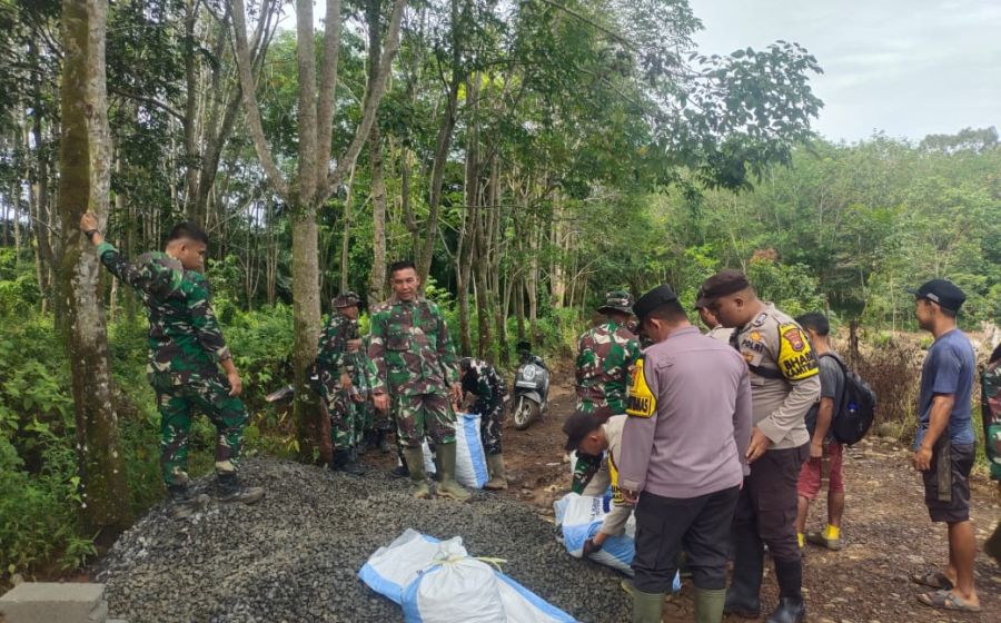 Kompak dan Gotong Royong, Satgas TMMD ke-126 Karungi Material untuk Permudah Pengangkutan ke Lokasi Rabat Beton