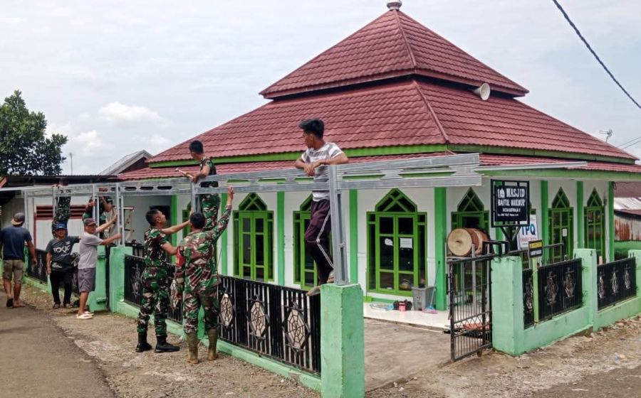 Gotong Royong Sasaran Fisik TMMD Pemasangan Kanopi Masjid Mulai Terpasang