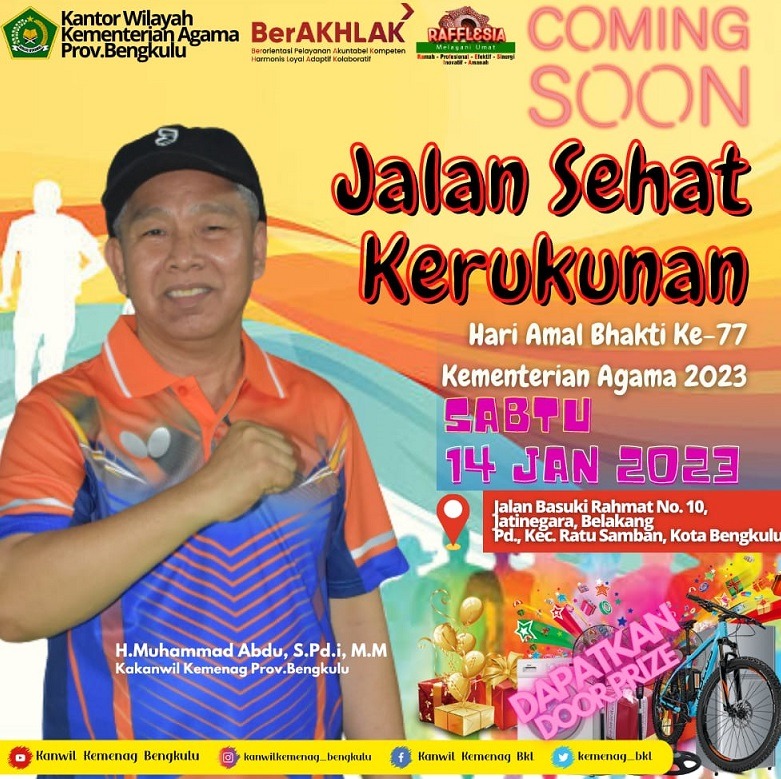 Jalan sehat dijadwalkan akan berlangsung pada Hari Sabtu, 14 Januari 2023. Kegiatan ini, rencananya akan dilepas secara resmi oleh Gubernur Bengkulu H. Rohidin Mersyah, dan Kakanwil Kemenag H. Muhammad Abdu.,S.Pd.I.,M.M.