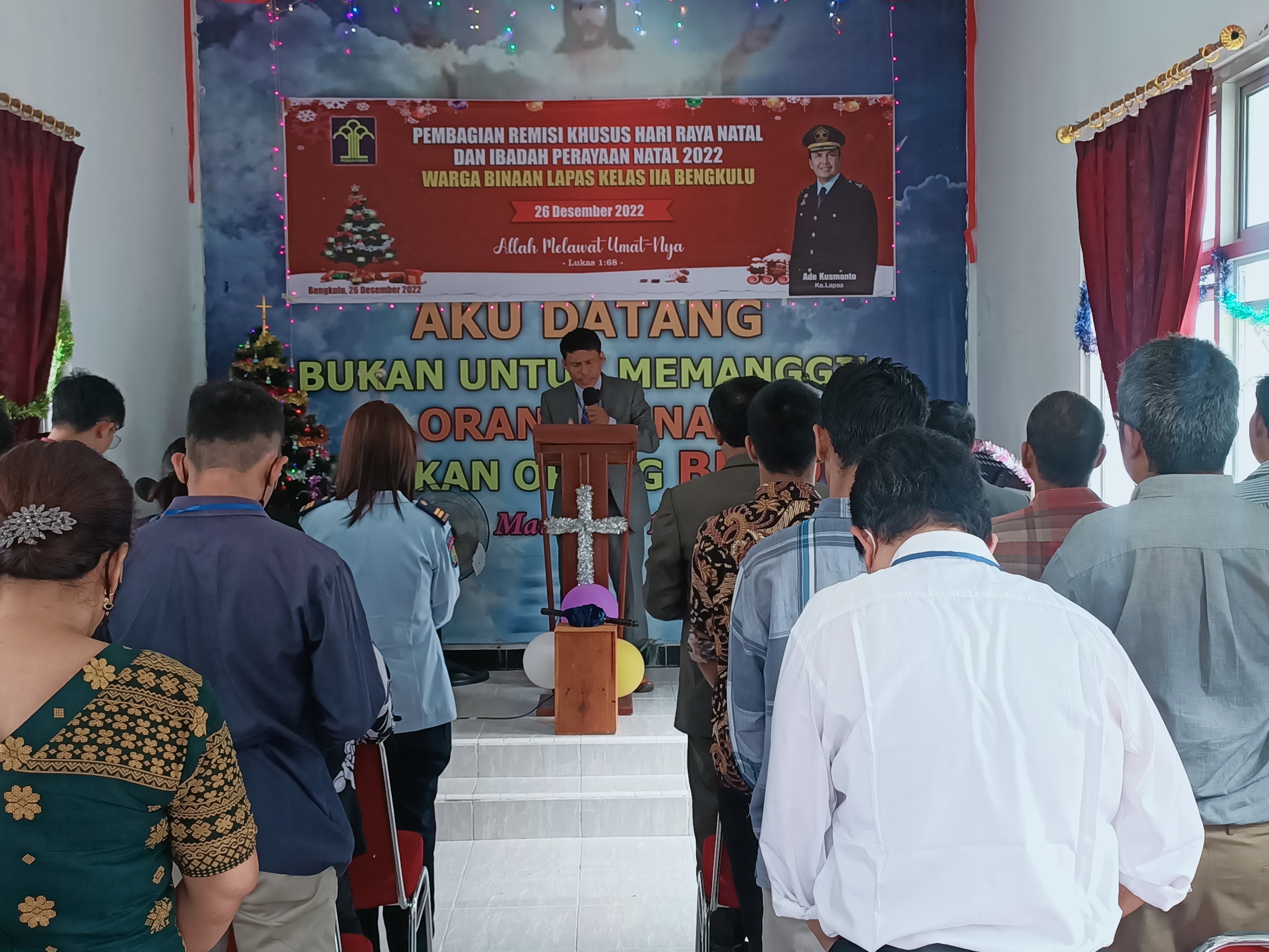BENGKULU - Seluruh warga binaan di Lapas Bengkulu Kelas IIA Senin (26/12) bersuka cita karena merayakan Hari Natal. Kepala Lapas Bengkulu Kelas IIA Ade Kusmanto melalui Kasubsi Bimkemaswat Lapas Bengkulu Tri Ghaly Ramadhitya yang juga Penanggung jawab kegiatan, mengatakan perayaan dilakukan dalam rangka menjaga toleransi sesama umat beragama dan untuk menjalin rasa persaudaraan.